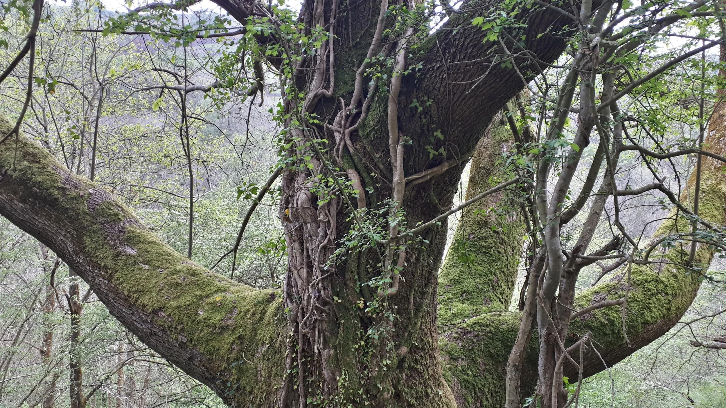 I step further into the depths of rising mist and changing air, relishing this waning moment of peace, charmed by the euphonic delights of goldfinches and medicinal scratches of Ruscus aculeatus; a sweet scarlet Pettigree. Once under the stance of woody giants, I bow in respect to leaders of future and past, headed by an enormous beech tree that emanates an air of deity.