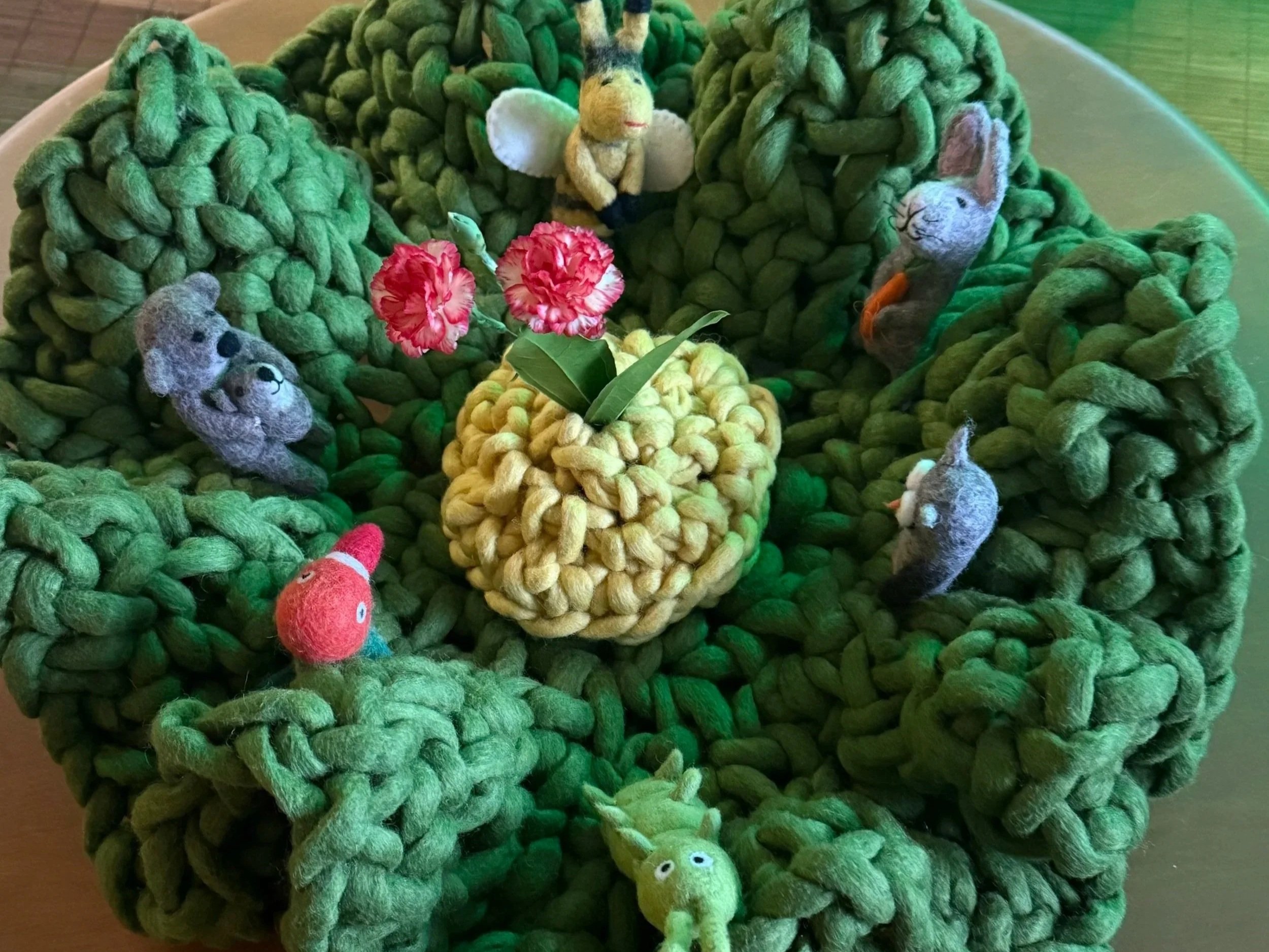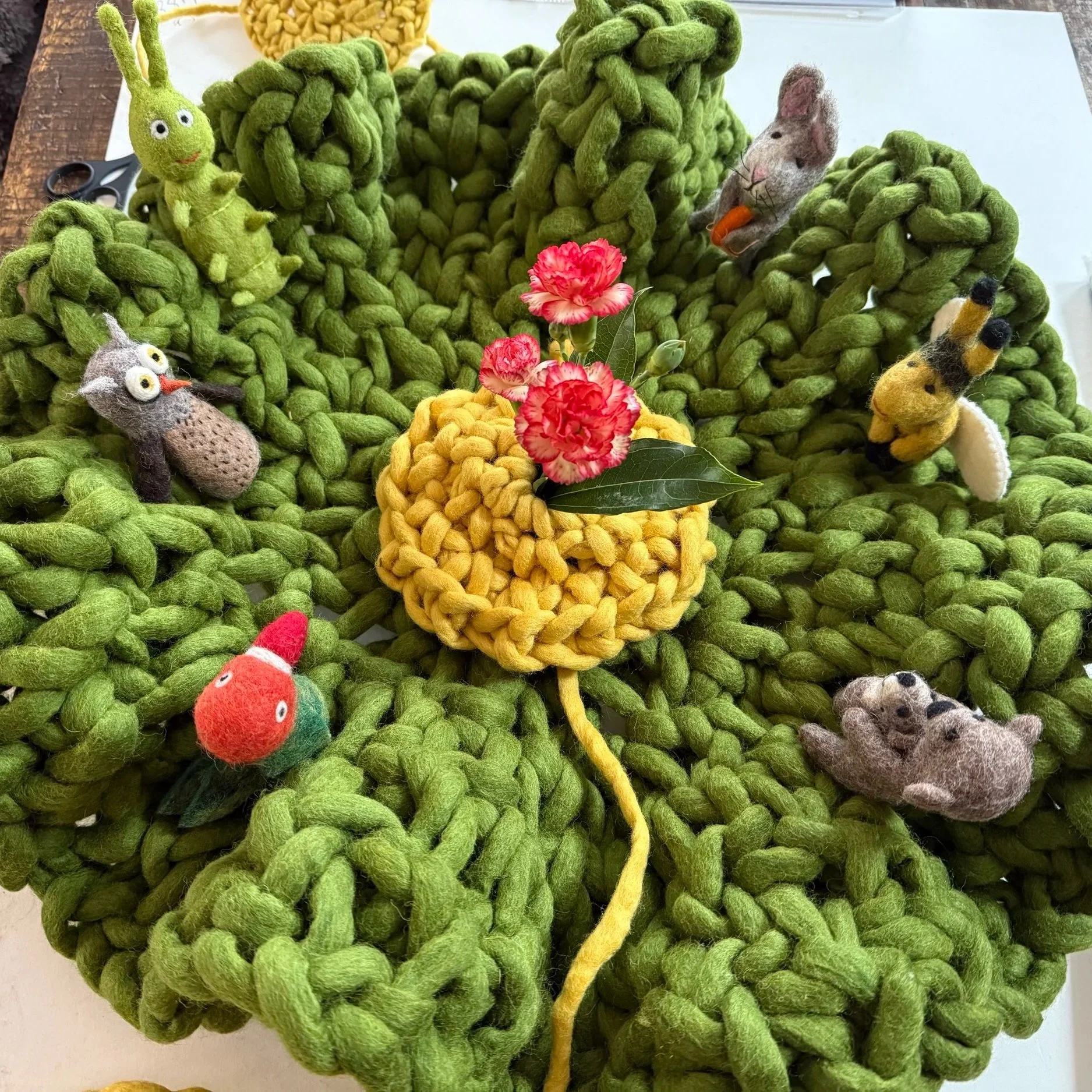 and a ball of moss-colored wool,